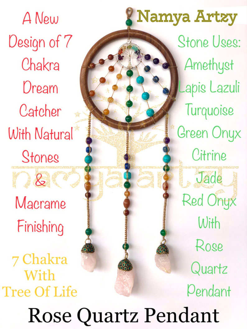 Completely Handmade Dream Catcher with knotted macrame work - With Rose Quartz Pendants and 7 Chakra Stones, You can see the fine quality of every knot in This Dream Catcher. Handmade Knotted 7 Chakra Natural Stones Dream Catcher With "Tree of Life" Symbol Reiki Healing.