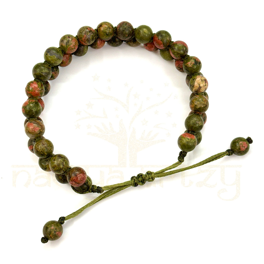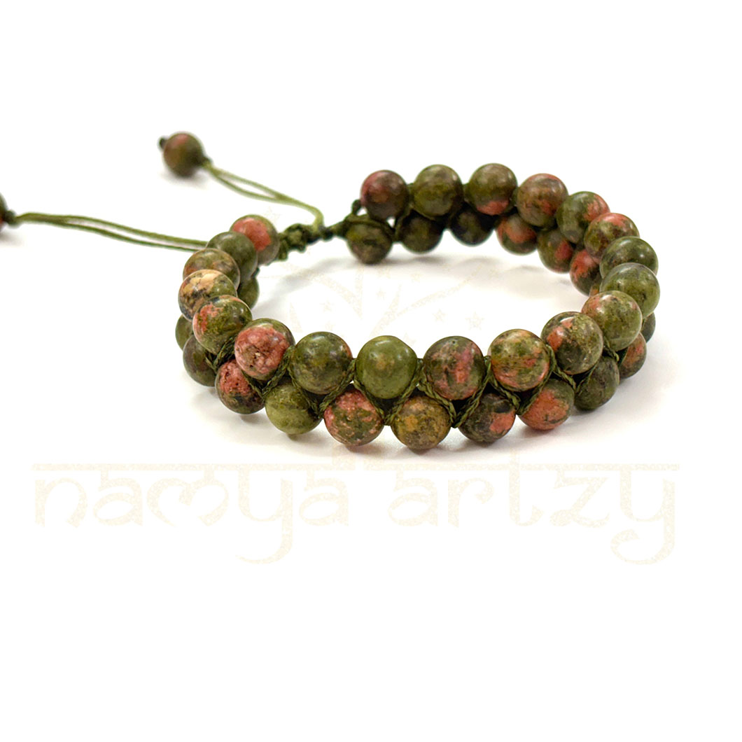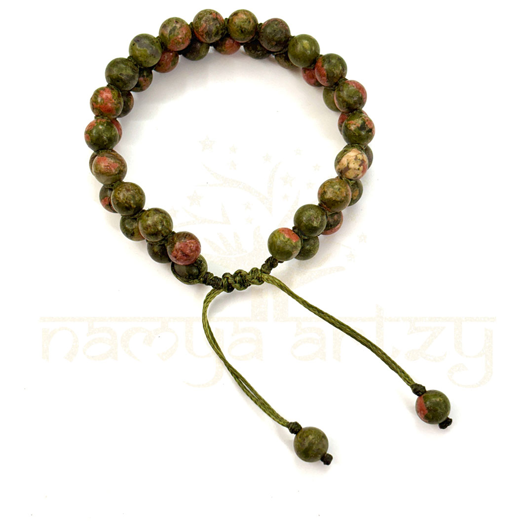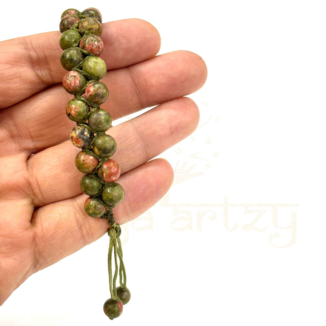 Handmade, Beautiful & Natural Unakite Quartz 8mm Gemstones Beads Customized Hand-knotted double-line Healing Bracelet with Unique and stylish Adjustable Sliding Clasp in Green color. It has an Unbreakable finish.