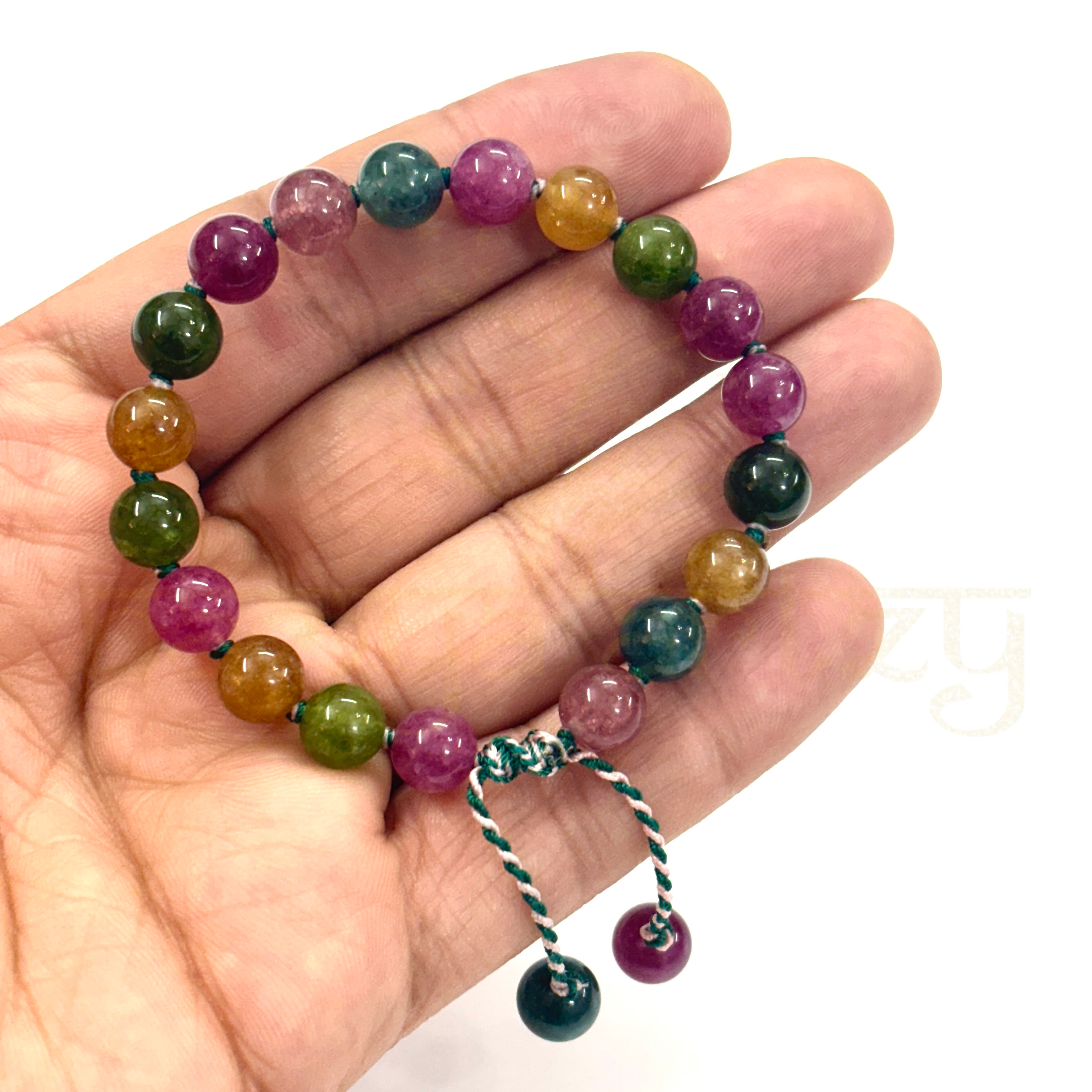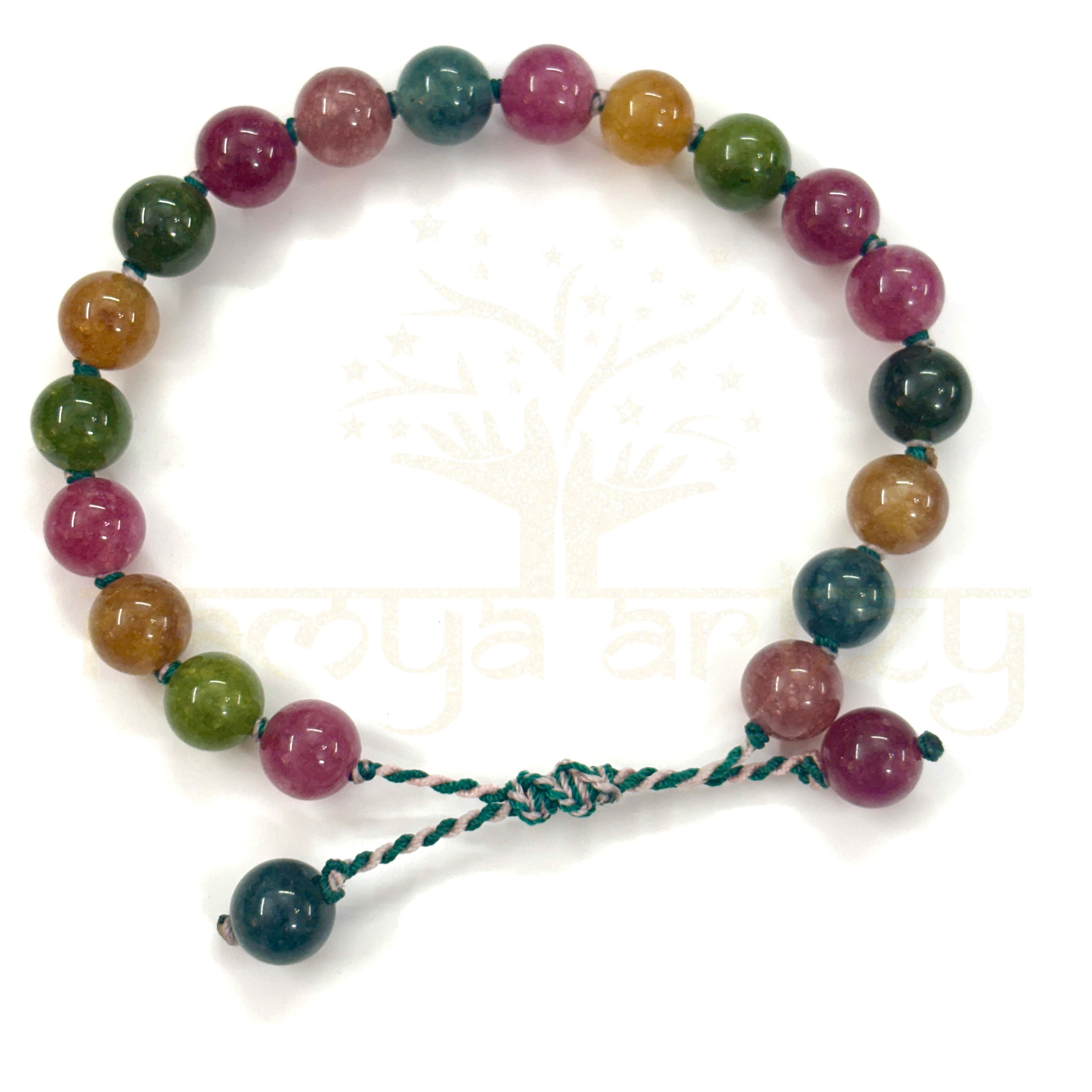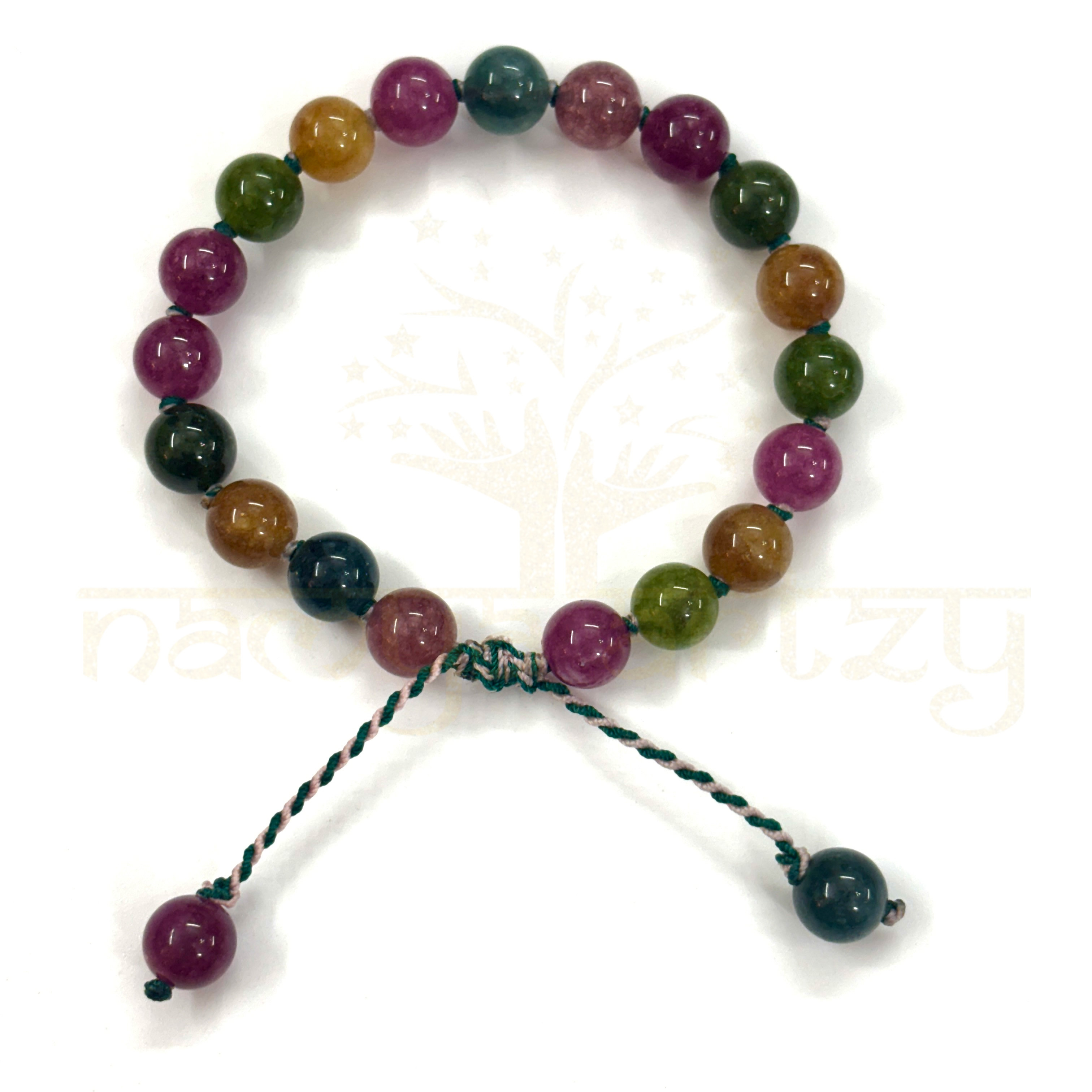 Handmade, Beautiful, and Natural 8mm Mix Tourmaline Gemstone beads, Customized Hand-knotted Finish After Each Bead, Healing Bracelet with Unique and stylish Adjustable Sliding Clasp in Mix-Color Cord. It has an Unbreakable finish.