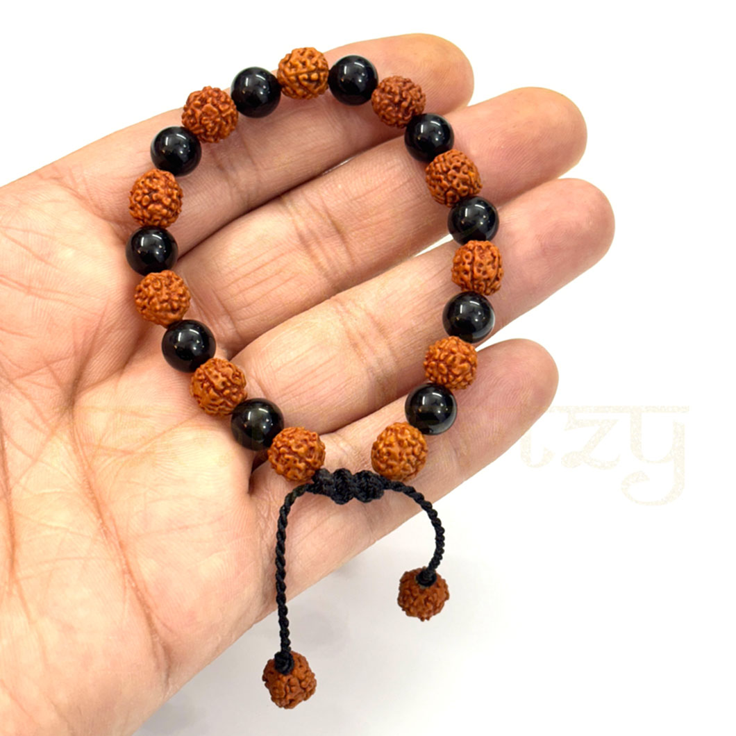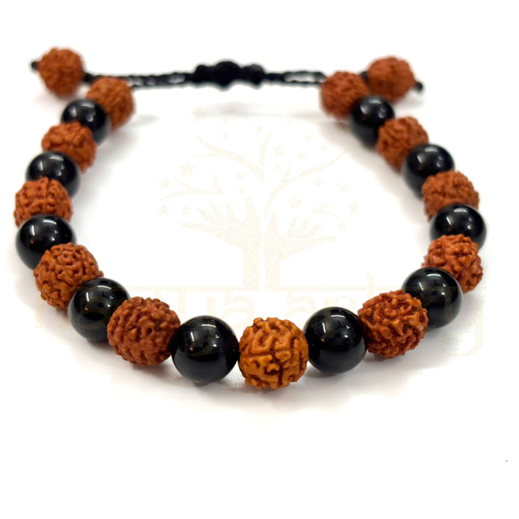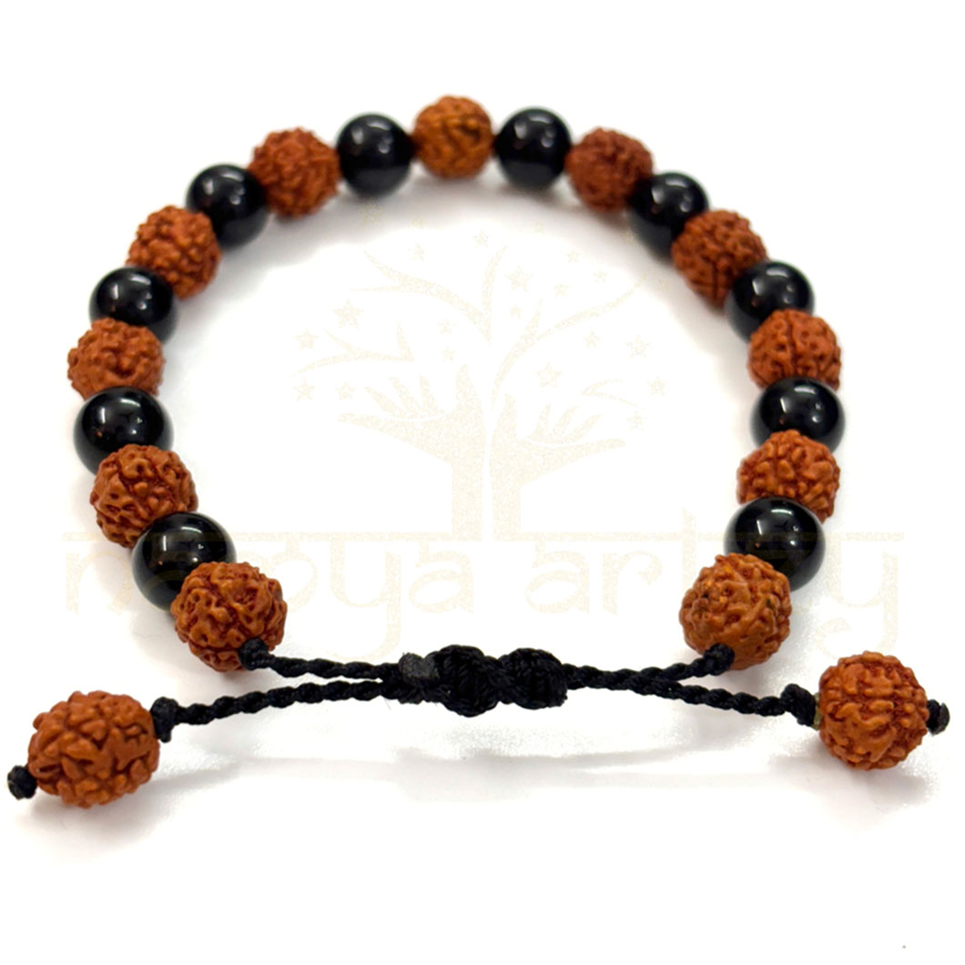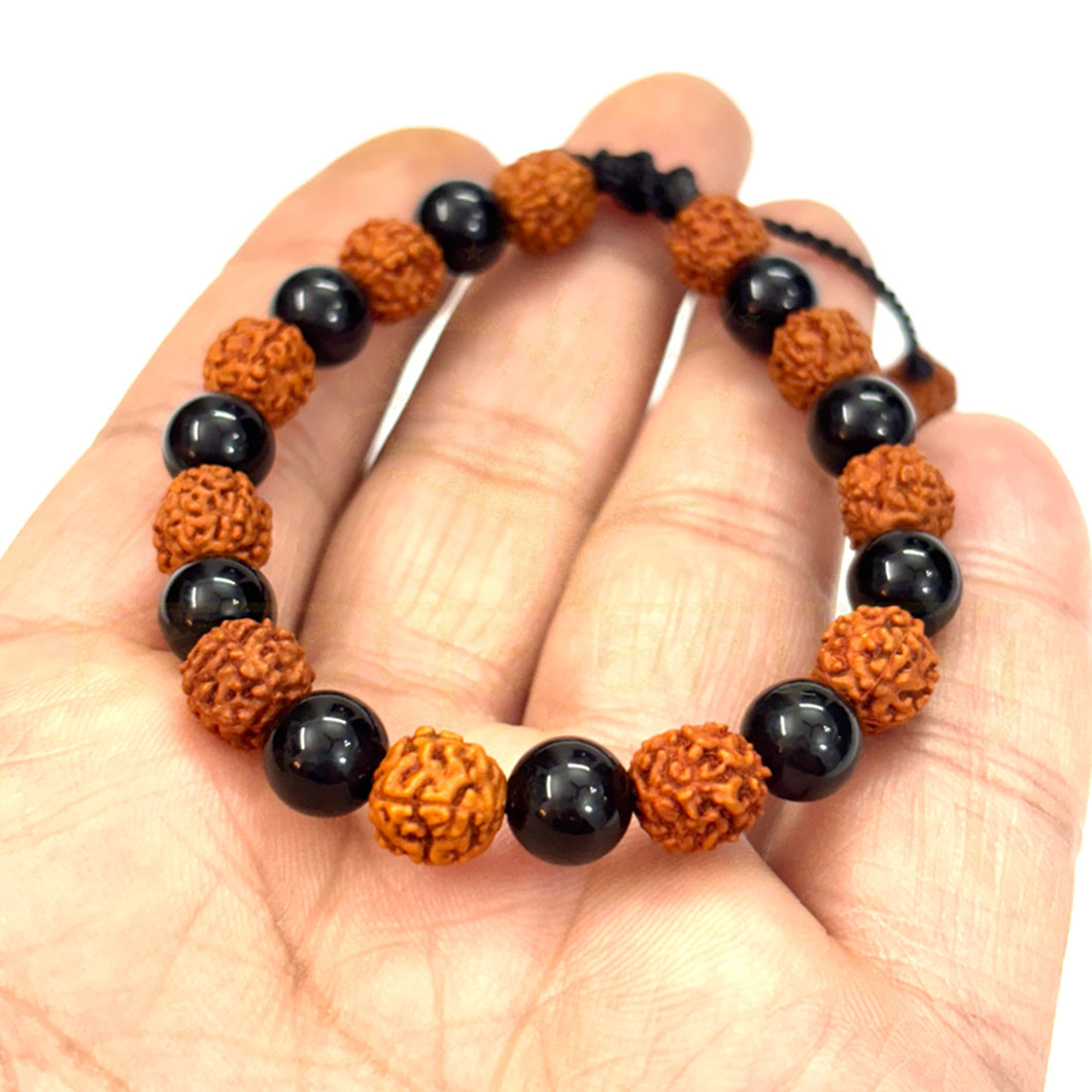 Handmade, Sacred Natural 8mm Mix-Face Rudraksha beads, Customized with Natural Black Onyx Gemstone Beads, are a Single-line Healing Bracelet with a Unique and stylish Adjustable Sliding Lock in Black-colored Thread. It has an Unbreakable finish.