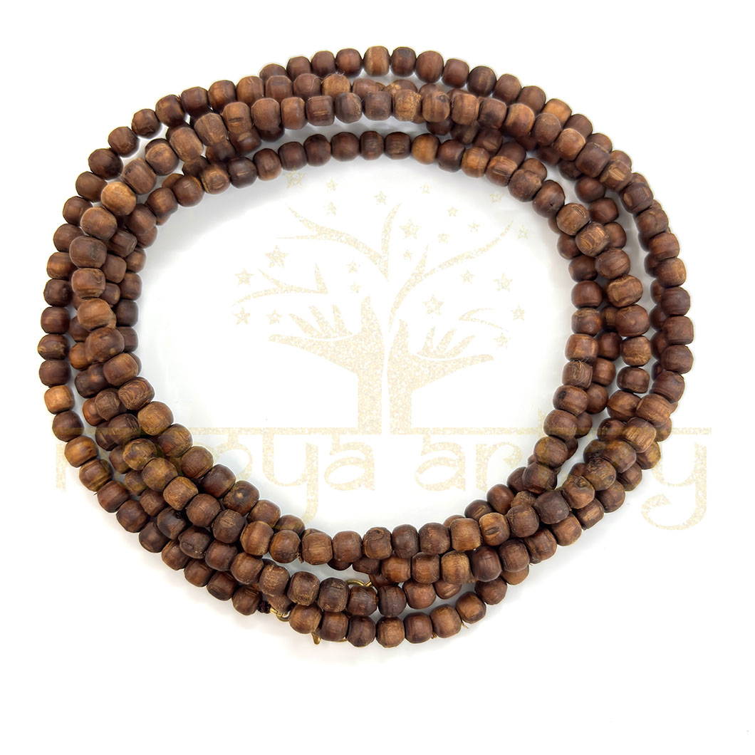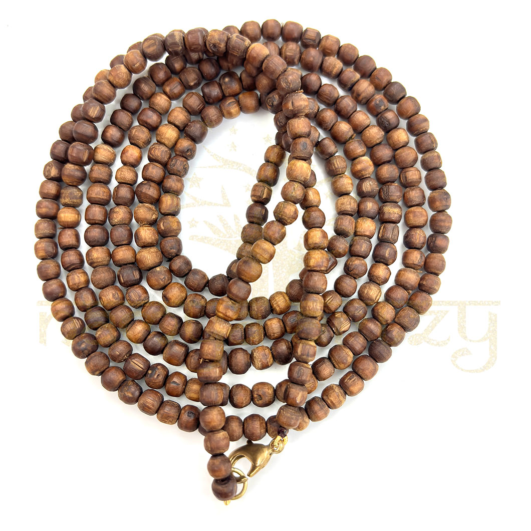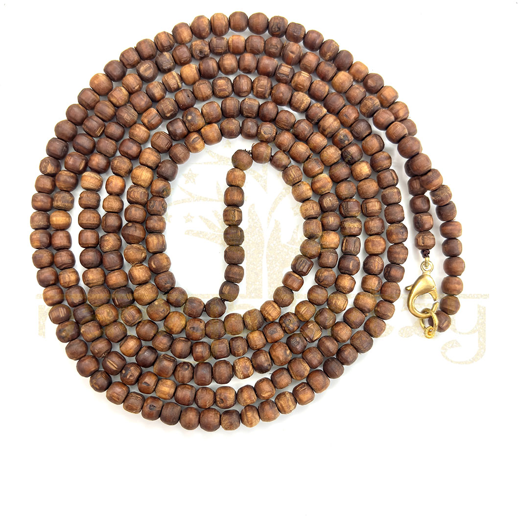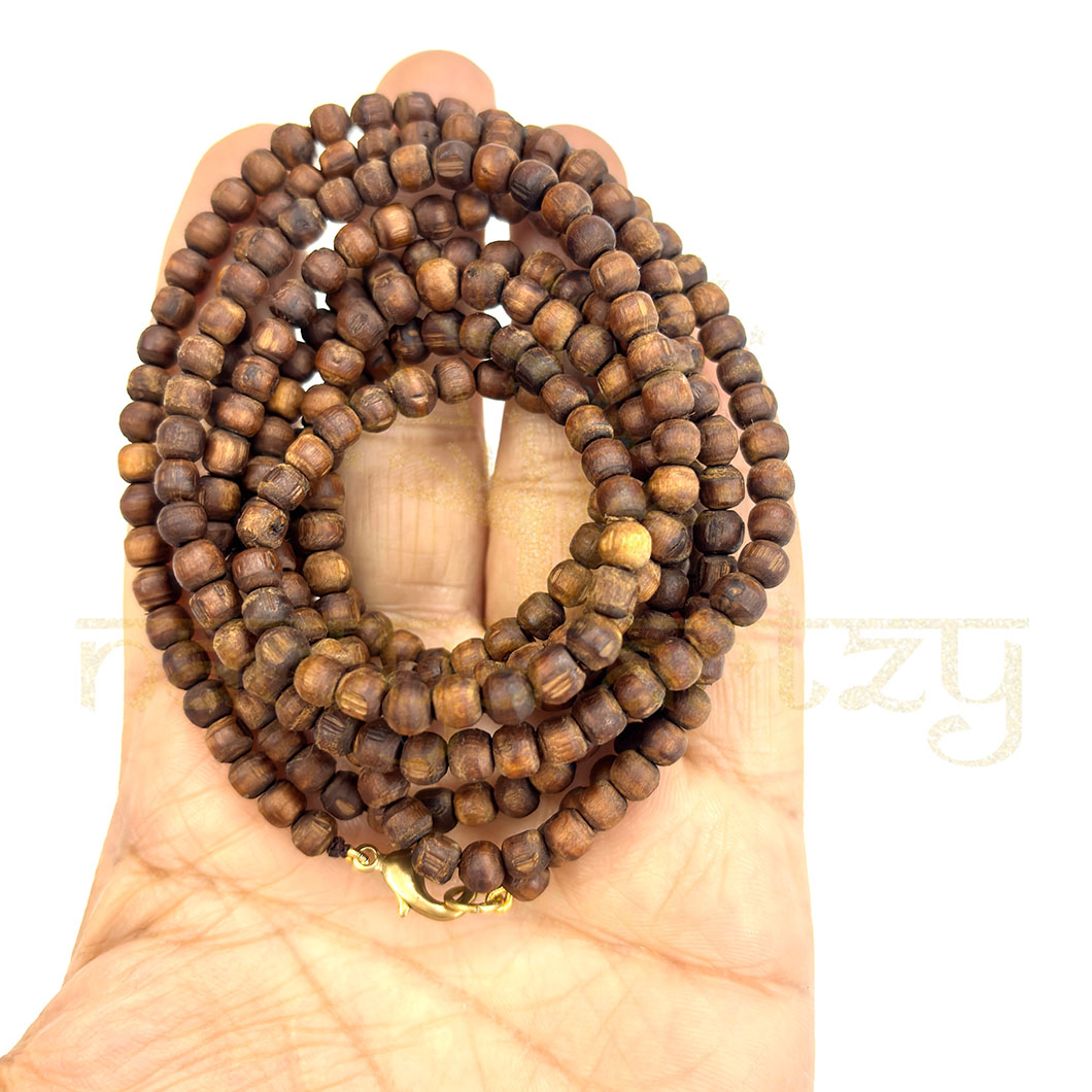 Completely Handmade, Sacred, Natural, Tiny 4mm Smooth Tulsi Wood Round-Shaped Beads 3 Line Kanthi Mala, Customized with Brown Cord, with Brass Fish Lock Finish. It has an Unbreakable Quality Finish.